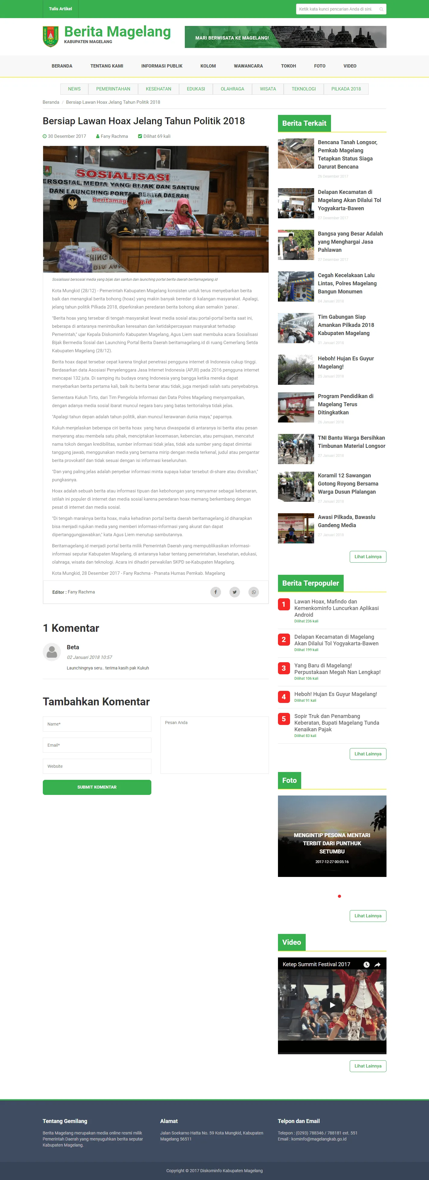 Keresahan ini pula yang dirasakan oleh Dinas Komunikasi dan Informasi (Diskominfo) Kabupaten Magelang. Perang melawan hoax (berita palsu) pun diupayakan. Untuk itu, adanya media cetak tentu tidak cukup untuk menandingi kecepatan informasi yang beredar di internet. Diskominfo butuh sebuah website portal berita sebagai sumber berita yang informatif khususnya seputar kejadian yang beredar di Kabupaten Magelang.