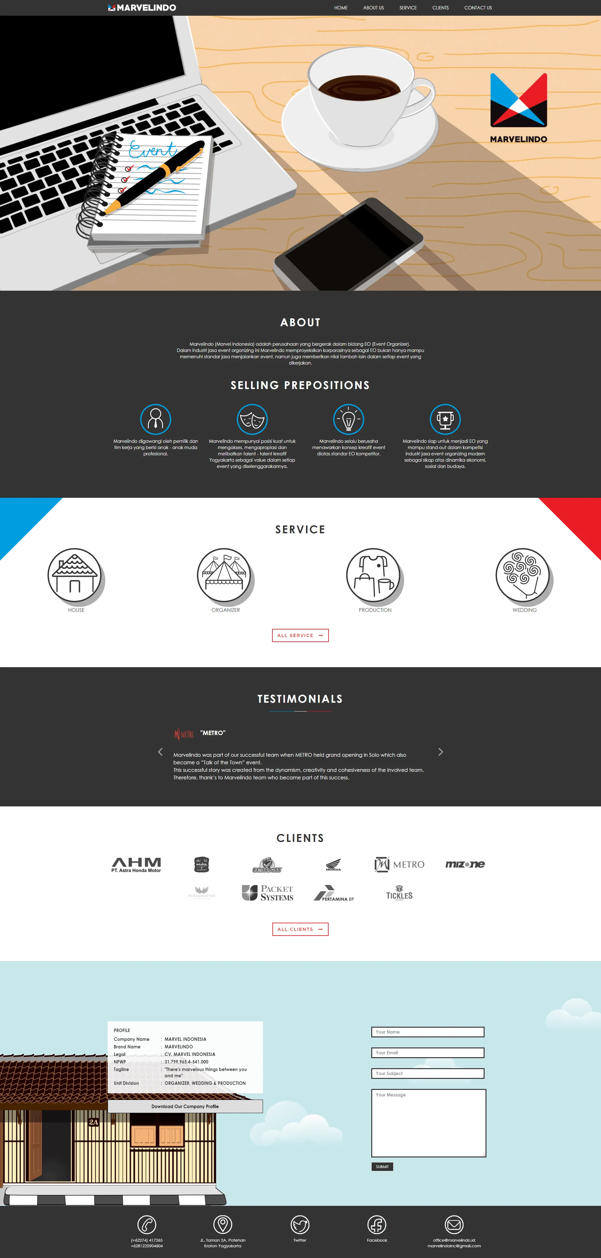 Marvel Indonesia atau biasa dikenal sebagai Marvelindo tentu tidak mau melewatkan kesempatan besar ini. Dengan segera, event organizer ternama di Yogyakarta ini menggandeng Tonjoo untuk merancang senjata utamanya dalam rupa sebuah website perusahaan. Website perusahaan memang seringkali dianggap remeh. Padahal, website perusahaan memainkan peranan penting untuk menciptakan impresi pertama yang berkesan di benak khalayak ramai.