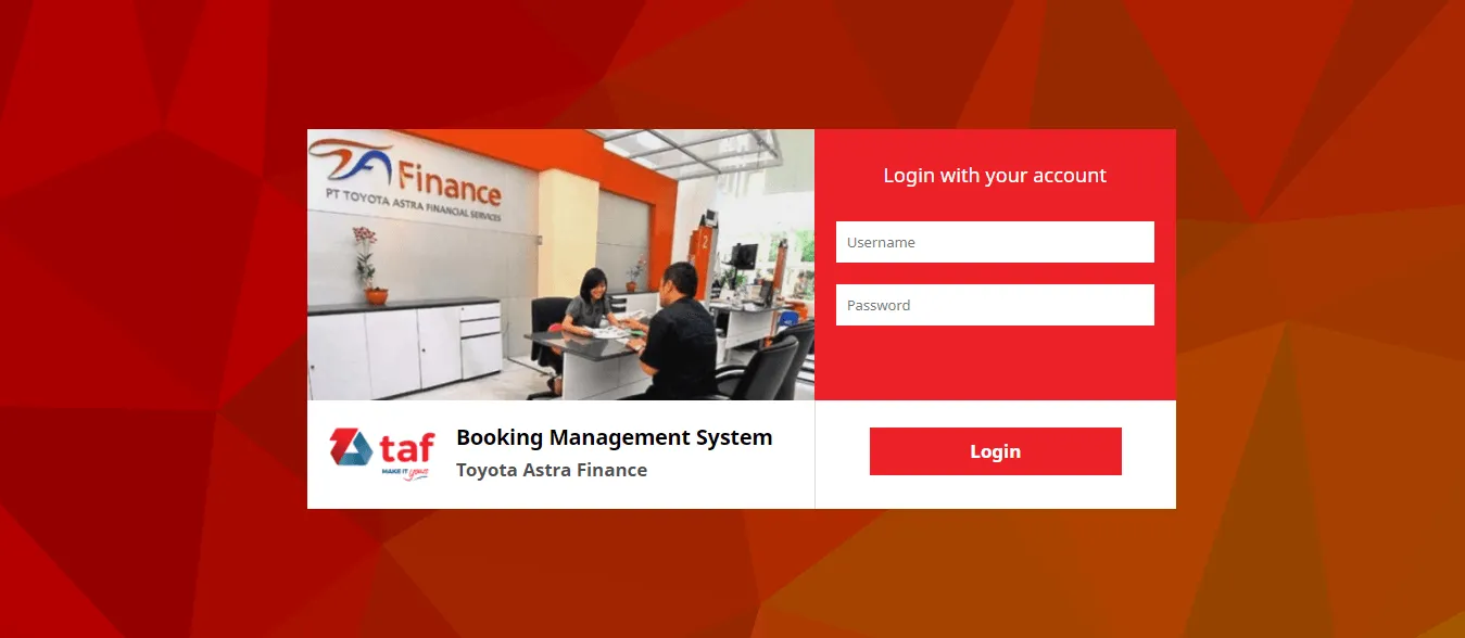 Kebanyakan orang setuju jika arus sistem informasi dan teknologi akan mempermudah berbagai kegiatan manajemen yang ada di perusahaan. Hal ini pun disetujui oleh perusahaan ternama di Indonesia, Toyota Astra Finance. TAF percaya manajemen sistem informasi yang diwujudkan dalam sebuah aplikasi akan memberikan banyak manfaat positif bagi perusahaan. Berangkat dari kebutuhan akan teknologi yang lebih mutakhir dalam kegiatan manajemen, TAF kemudian memilih Tonjoo sebagai mitra yang terpercaya dalam membangun sebuah aplikasi yang tepat guna dan sesuai dengan kebutuhan.