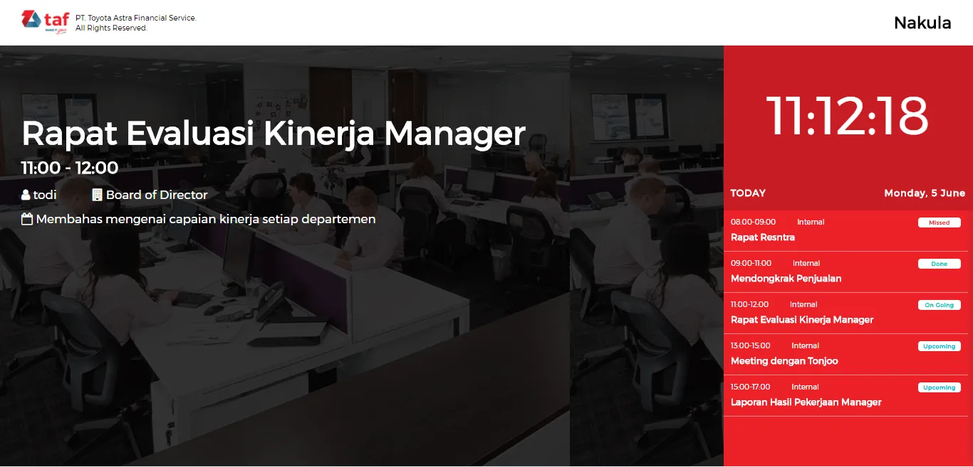 TAF Booking Management adalah aplikasi berbasis web yang diperuntukkan sebagai sistem informasi untuk manajemen penyewaan ruangan di perusahaan Toyota Astra Finance. Segala macam kegiatan untuk mengawasi penggunaan ruangan, mengecek ketersediaan ruangan, serta melakukan pemesanan penggunaan ruangan untuk acara khusus maupun acara rutin dapat dilakukan melalui aplikasi ini.