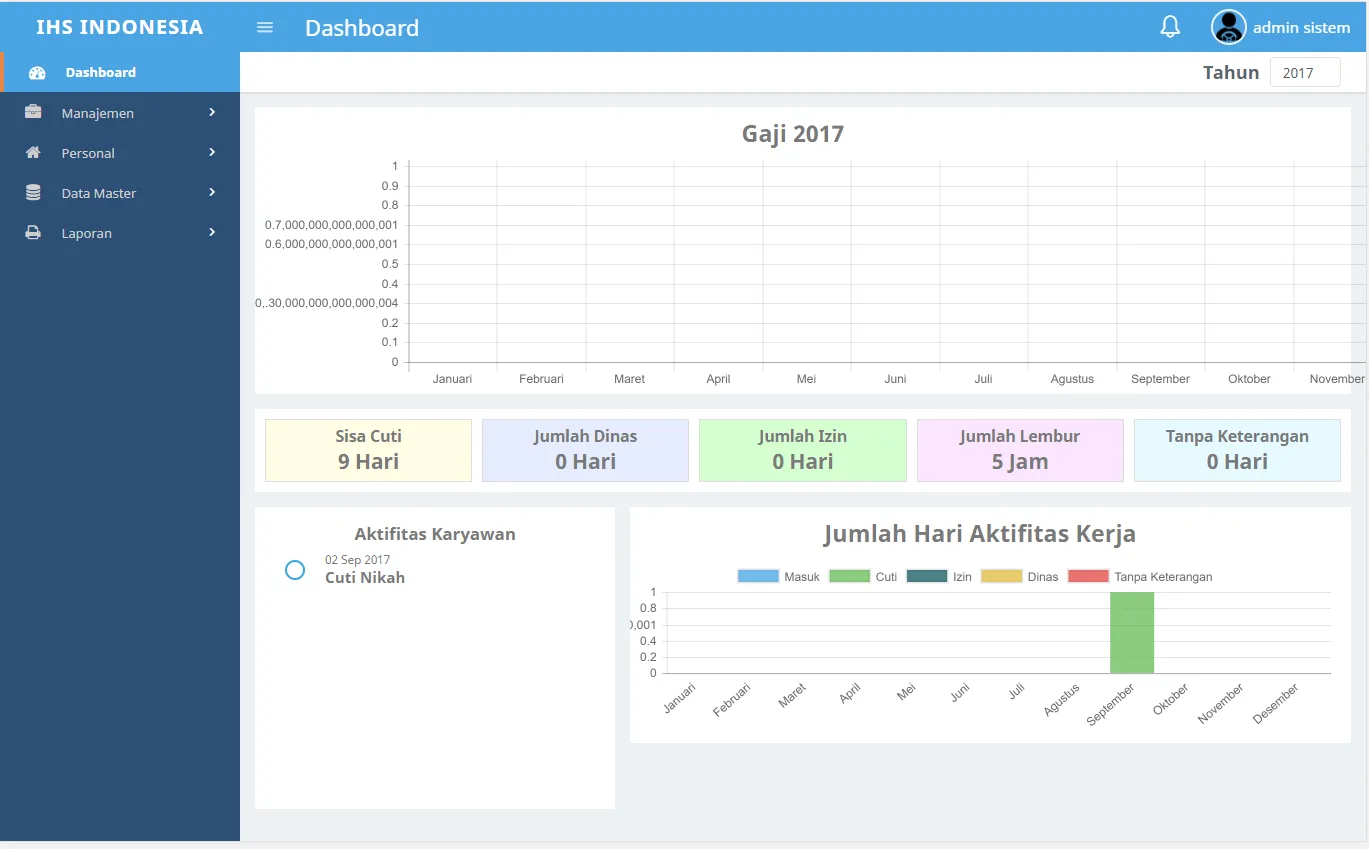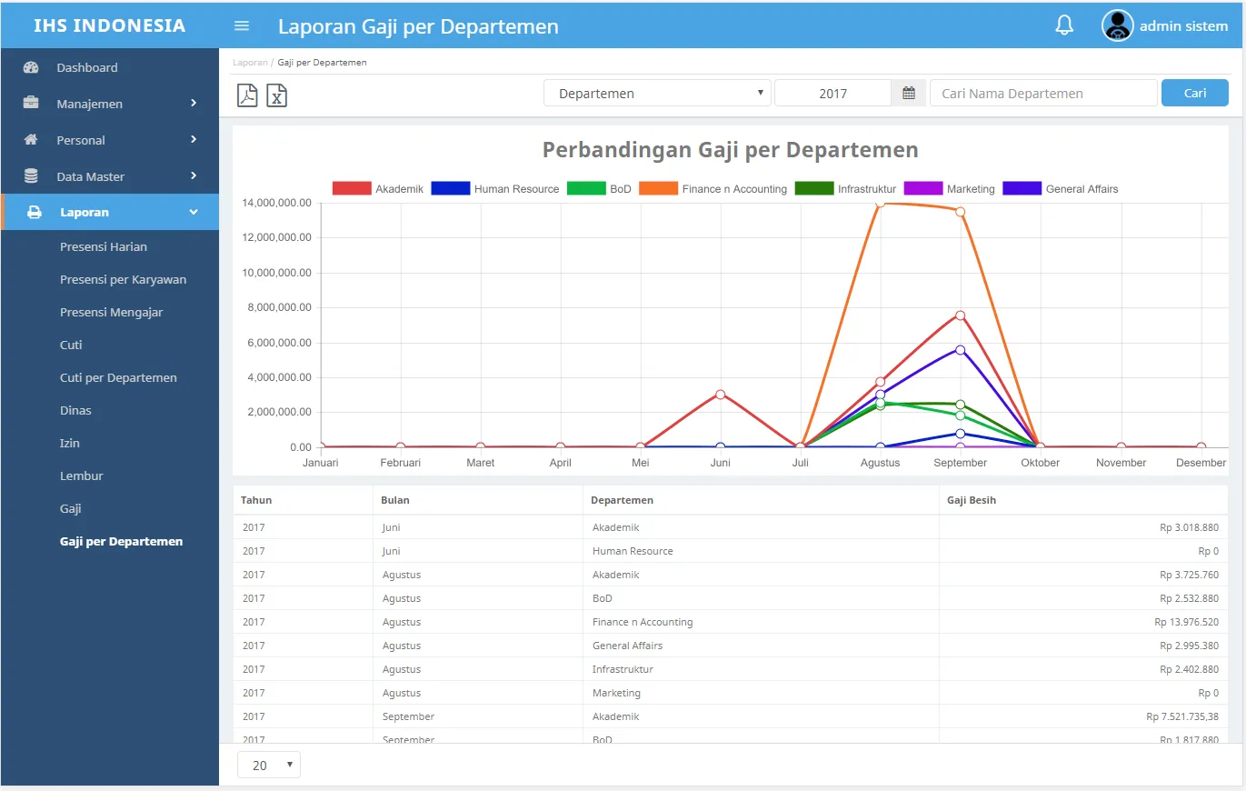 As its function as a human resource information system, HRD information system owned by IHS can be used as data reference for other parties. In the report section, all employee data, activities, up to the salaries of each department will be summarized.