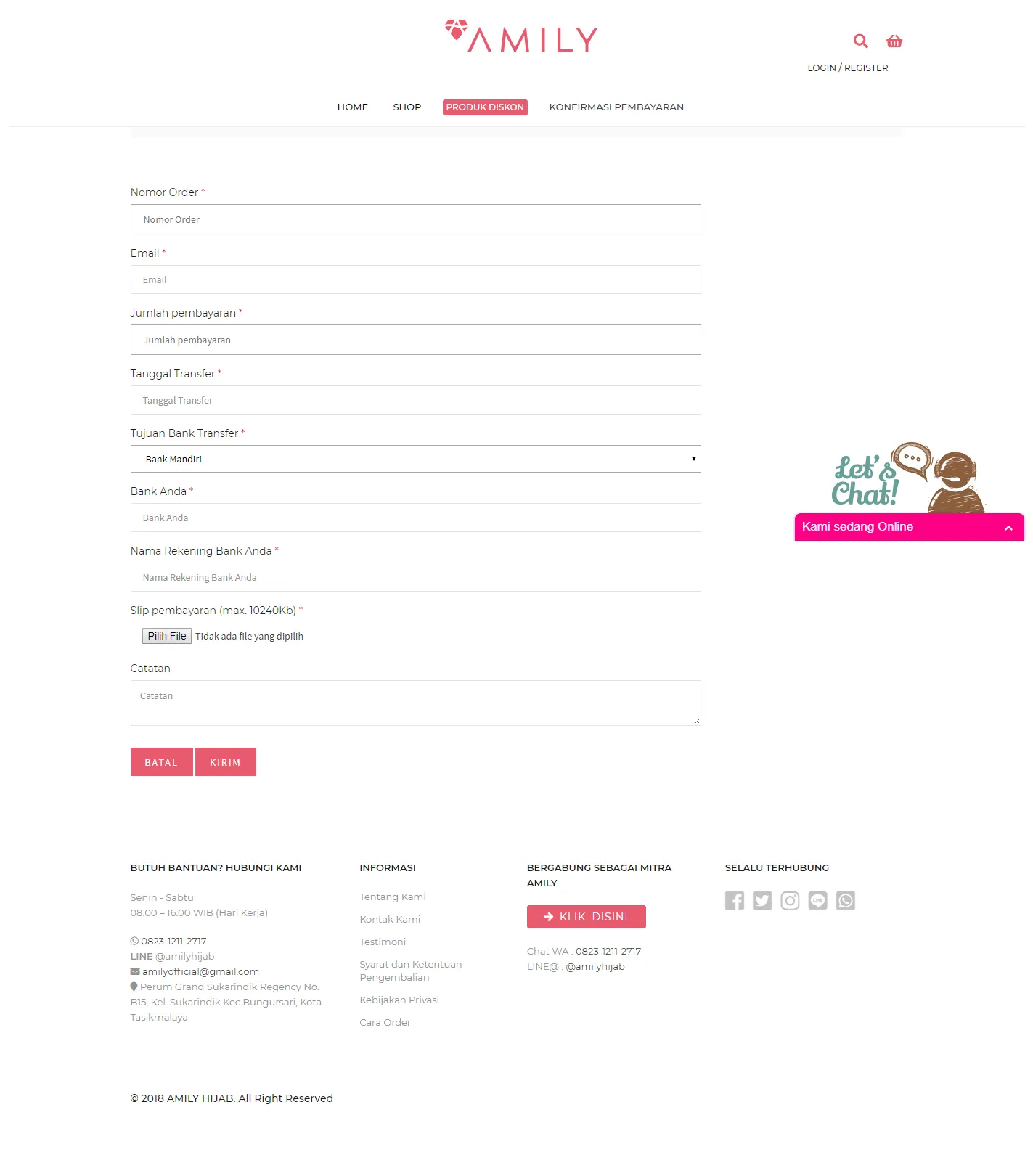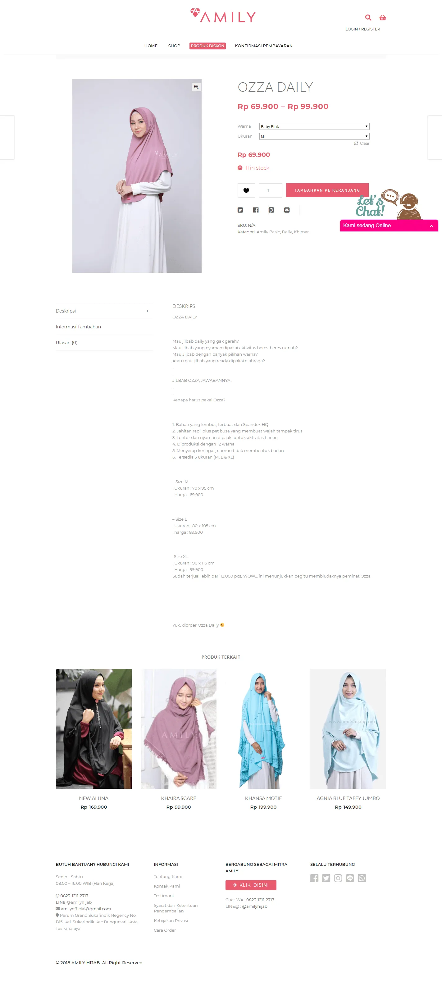 - Thứ nhất, trang web thương mại điện tử phải có khả năng thực hiện nhiệm vụ chính của nó là một cửa hàng trực tuyến. Bằng cách đó, người tiêu dùng của Amily Hijab luôn có thể ghé thăm và mua sắm mọi lúc mọi nơi. Tonjoo cũng tích hợp nhiều tính năng khác nhau để giúp khách hàng dễ dàng mua sắm trực tuyến như bảng giá vận chuyển tự động và biểu mẫu xác nhận thanh toán.
